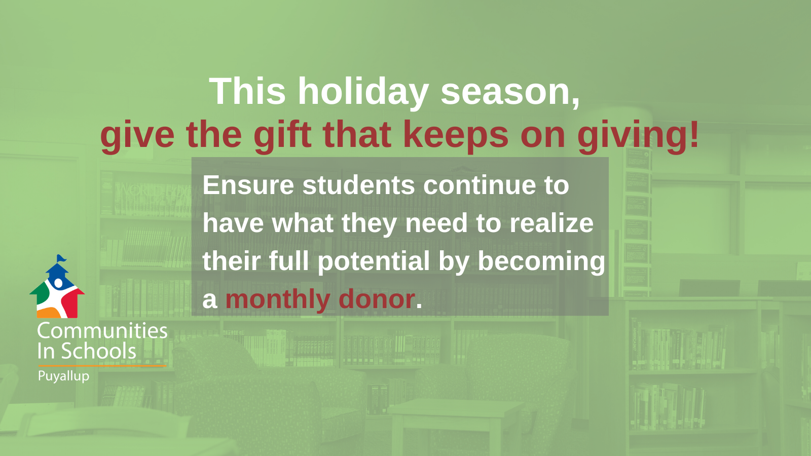 This holiday season, you can give the gift that keeps on giving. Sign up for monthly giving at the level of your choice, and this gift will help to provide vital services to elementary school kids in Puyallup.